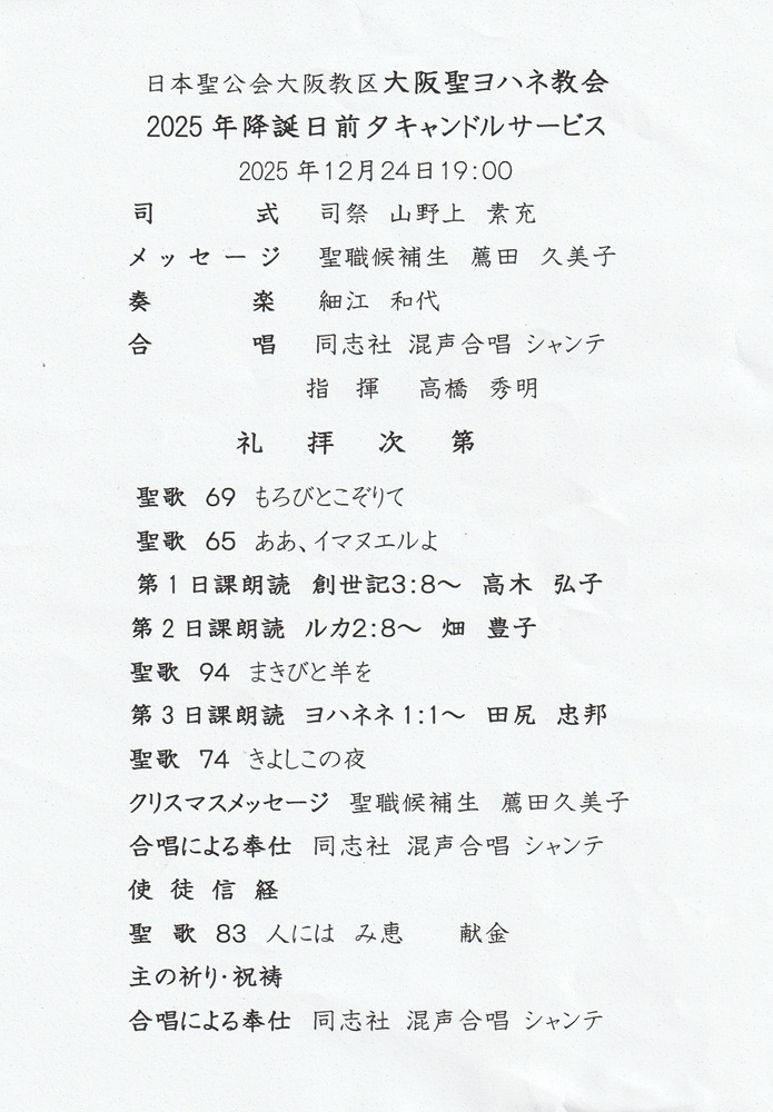 聖ヨハネ教会2025年降誕日前夕キャンドルサービス 奉仕 |